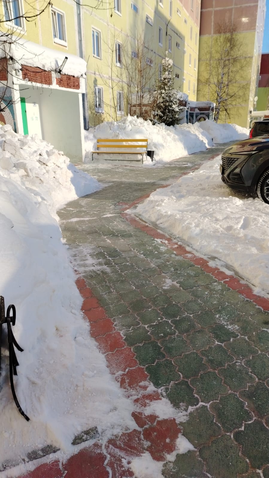 Доброго дня! На Ваше обращение сообщаем, что механизированная расчистка двора многоквартирных домов № 2, 5, 14, 15 произведена в конце декабря 2024 года. Очистка тротуаров производится по мере выпадения осадков. Уборка до основания тротуарной плитки не осуществляется (риски скольжения). На текущую дату снежные массы удалены.